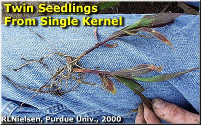 From a single kernel of corn had developed two plumules and, subsequently, two sets of mesocotyls, coleoptiles and eventual seedlings. Only a single seminal root system was evident, but each seedling was developing its own set of nodal roots.