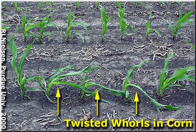 These images depict the phenomenon known as 'twisted whorl' in corn. The