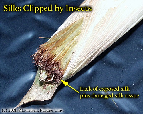 been extensive silk clipping by either corn rootworm or Japanese beetles during