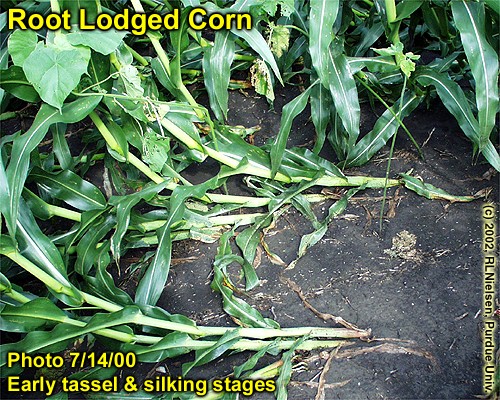 These images are of root lodged corn at the V12 (twelve visible leaf collars) and VT/R1 (tasseling/silking) stages of development following the occurrence of strong wind events in 2000 (VT/R1 plants) in westcentral Indiana and 2002 (V12 plants) in eastcentral Indiana. One of the major contributing factors that made the plants vulnerable to root lodging in both years was severe root damage by corn rootworm (CRW) larvae in a corn/soybean crop rotation. In 2002, the effects of CRW larval feeding on the nodal roots was compounded by very dry soil conditions during the initial nodal root formation period.
