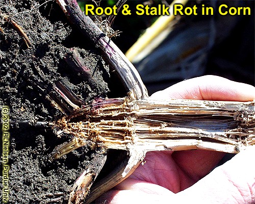 Such remobilization of stored carbohydrates from lower stalk tissue causes an overall deterioration of lower stalk integrity and strength. More importantly, as carbohydrate concentrations decrease in the lower stalk or root tissues, their resistance to the soil complex of root- and stalk-rotting organisms also decreases.