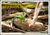 Grain moisture at harvest in fields where immature corn suffered varying degrees of stalk lodging will likely be quite variable because of the varying times of plant death and kernel maturation. Grain from plants that remained standing will mature later than that of immature stalk lodged plants that die prematurely (see above photo of ear comparison). Coupled with variable kernel maturation timing is the moisture consequence of grain on ears of lodged plants that may be lying directly on the ground or in close proximity to the soil surface and, in many instances, shaded by stalks and leaves of the lodged plants (photo below).