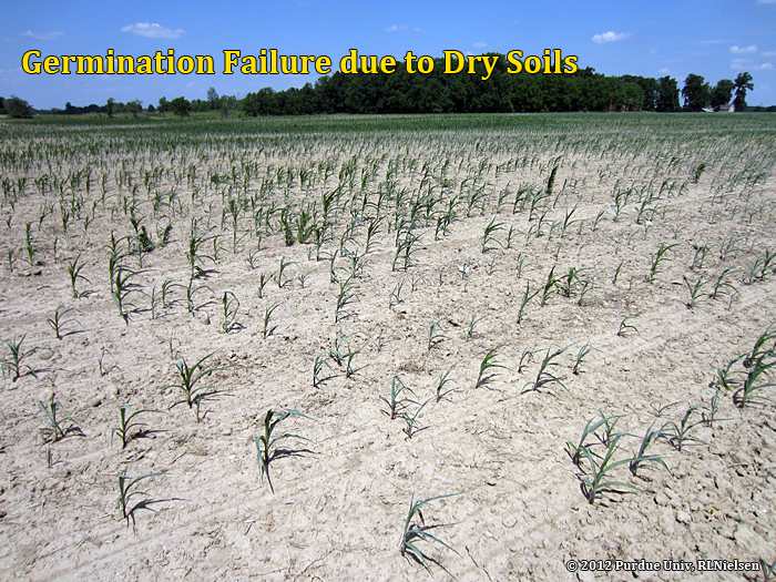 Much of the state's corn crop will enter the critical pollination phase over the next two or three weeks (Nielsen, 2012b). Continued lack of adequate rainfall during this period will place undue stress on the crop. Forecast excessive heat during the same time period will only amplify the stress; resulting in delayed silk emergence, premature pollen shed, tassels failing to emerge from whorls, potentially inviable silks or pollen, poor synchrony between exposure of silks and availability of pollen, incomplete pollination success, or abortion of newly developing kernels. Yield loss per day during pollination due to severe stress is often estimated to be 5 to 10 percent. Yield loss for any given field could easily approach 100 percent with continued drought/heat stress due to complete failure of the pollination process.
