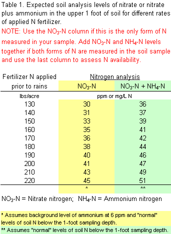 This table includes estimates of expected soil NO3-N levels with different fertilizer rates assuming “normal” background levels of nitrate and ammonium at the time of fertilization and a “normal” amount of movement below the one foot sampling depth (approximately 1/3 of the fertilizer N is moved below the 1-foot sampling depth but retained within the root zone with normal rainfall).