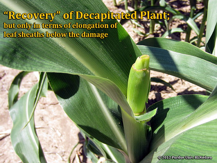 Early in the growing season, deer will sometimes feed on the whorls or tops of young plants from about growth stage V10 (ten leaves with visible leaf collars) to about V16 when the immature tassel, still inside the whorl, is 4 to 6 inches long. Rather than actually eat the whorl leaves, the deer are apparently attracted to the succulent immature tassel. The results are decapitated plants whose young whorl leaves have simply been pulled out and (I can only imagine) the tassel somehow teased out and eaten. The mostly intact, though no longer attached, whorl leaves are left behind on the ground along with the tell-tale evidence of hoof prints and deer scat. The decapitated plants usually survive and ear development will continue through pollination and on to maturity, though the ears are usually less than full size owing to the fact that most of the photosynthetic leaf area above the ears is missing.