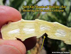 Impact on Yield? Remember that the ear shank is the final "pipeline" for the flow of photosynthates into the developing ear. An ear shank that collapses prior to physiological maturity will greatly restrict, if not totally prevent, the completion of grain fill for that ear and will likely cause premature black layer development in the grain. If the droopy ears have not yet black layered, they will black layer prematurely; sooner than neighboring erect ears.