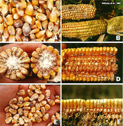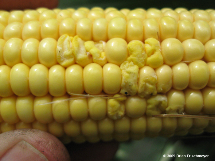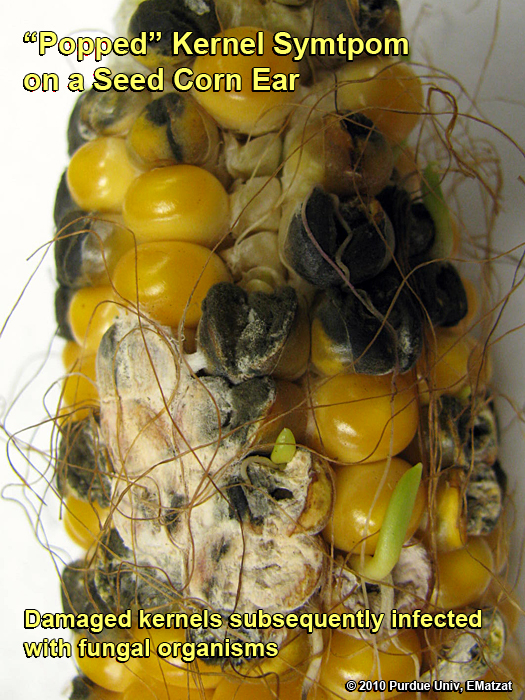 The "popped-kernel" symptom and the related "silk-cut" symptom are indeed corny oddities in that they rarely occur in commercial hybrids in Indiana but occasionally occur at significant levels in seed corn inbreds. Unfortunately, when the symptoms do occur, they predispose the affected kernels to attack by ear-rotting fungal organisms.