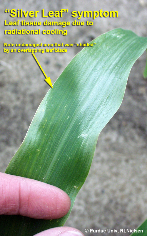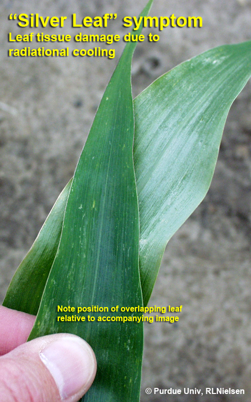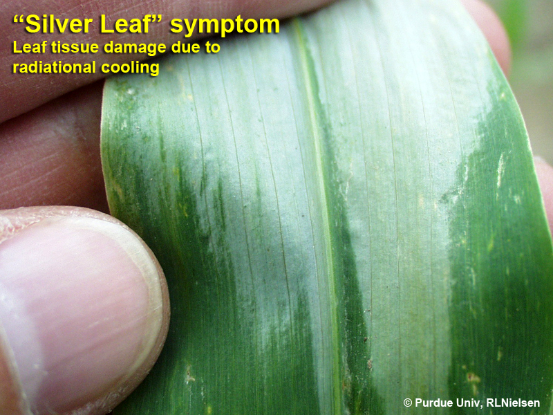 Rapid heat loss from terrestrial surfaces to the atmosphere (i.e., radiational cooling) can occur on clear, dry (low humidity), calm nights with temperatures in the low 40's F or cooler. Many areas of Indiana experienced such low morning temperatures over Memorial Day weekend. Minor levels of radiational cooling can damage the outer surfaces of corn leaves that are positioned horizontally or parallel to the night sky. The subsequent symptom of such minor chilling injury is often referred to as "silver leaf" in corn.