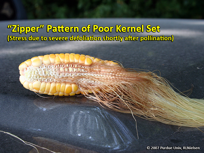The occurrence of severe photosynthetic stress (severe drought, extreme heat, severe nutrient deficiency, severe foliar disease) during or shortly after pollination in corn often results in poorly filled ears due to incomplete pollination or abortion of young kernels. Often such poor "kernel set" occurs primarily on the tip end of a cob, but some times the problem manifests itself down one side of the cob, affecting several rows of potential kernels. Such a pattern of poor kernel set is euphemistically referred to as a "zipper ear".