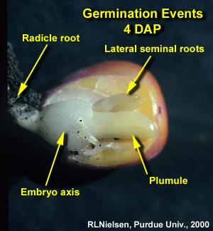 The three visible indicators of successful germination in corn are the appearances of the 1) radicle root, 2) plumule and 3) lateral seminal roots. These images illustrate these events for several kernels of corn at three or four days after planting with warm soil temperatures.