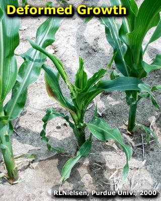 The occurrence of wilted or dead whorls in young corn or deformed corn plant development almost always suggests a problem with the growing point area. The problem can be the result of physical damage to the growing point area by piercing or penetrating insects like the stinkbug or billbug. Other insects like black cutworm or stalk borer injure the growing point area if they tunnel and/or feed in that region of the young corn stem. Equipment tire traffic (e.g., turning on end rows) can easily injure the growing points of young corn older than about leaf stage V4. More common seedling blight organisms can also injure the growing point by virtue of their development into the crown area of young seedlings.