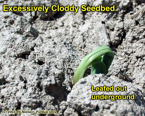 The ability of the clods to physically restrict the emergence of the coleoptile depends on their size and weight plus the degree to which the clods have cemented together with subsequent rains. Technically, the clods do not cause the seedling to leaf out underground. Rather the effect is indirect as a result of the restriction of the coleoptile emergence. The developing leaves inside the coleoptile rupture through the coleoptile relatively on schedule. Its just that if the coleoptile emergence through the soil surface has been delayed, the normal leafing out occurs below ground rather than above ground. Ditto for the effects of a severely crusted soil surface on corn emergence. A technicality to be sure, but this knowledge may someday win you a trivia contest.