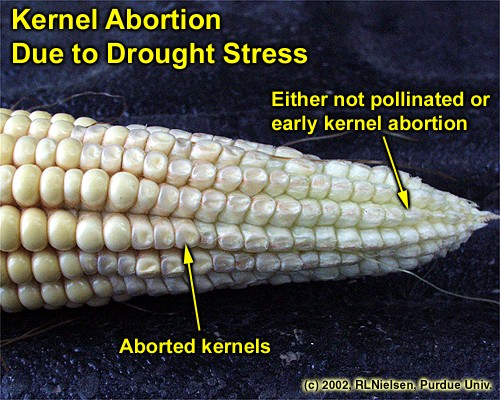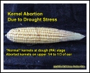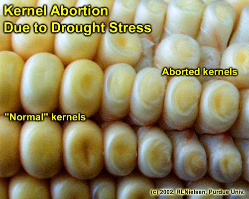 These images depict kernel abortion on ears of corn from a visibly drought-stressed field that I walked on August 1. The plant symptoms included death of lower leaves plus severe rolling and the typical grayish cast to the green color of the remaining live leaves. The kernel development stage of the surviving ("normal") kernels was R4 (dough), suggesting that pollination had occurred in the early part of July.