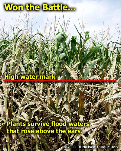 Less obvious is the damage to plants on the higher elevations within the flood plain that were only partially submerged, particularly those fields where pollination was in progress or that were in the early grain filling period following pollination. These plants withstood the onslaught of flood waters that rose to heights above the ear but quickly receded with little to no major structural damage to the plants. Unfortunately, these survivors along the fringes of the major flooding may have won the battle, but may lose the war because of the potential for the development of bacterial ear rot as a consequence of the exposure of the immature ears to the muddy flood waters.