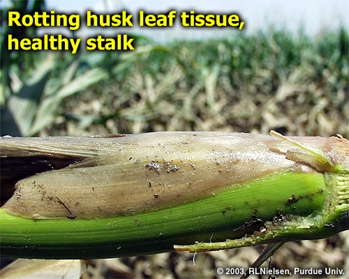 The corn plants themselves were still green and technically alive, but the husk leaves were a discolored, slimy, soft, and smelly mess; especially at their basal ends near the point of attachment to the stalk node. The immature ears also exhibited varying degrees of gray, slimy, and soft rotting tissue. The odor associated with this slimy mess of rotting plant tissue reminded me of fermenting corn silage.