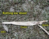 The following images illustrate the occurrence of bacterial ear rot in a corn field along the Wabash River in Vermillion County, Indiana. The field was adjacent to one that was totally destroyed by flood waters, but which itself had been briefly immersed up to and just beyond the ear shoots.