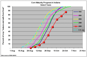 onday's report from the USDA National Agricultural Statistics Service (USDA-NASS, 2009) reaffirms that the 2009 Indiana corn crop is continuing its near-record slow pace of development, maturity, and harvest. As of 25 October, 87% of the state's corn crop had reached maturity (Fig. 1) and 21% of the crop was reported as having been harvested (Fig. 2). These numbers represent progress that is 3 to 4 weeks behind the five-year pace for maturity and harvest.