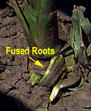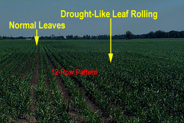 These photos are from a field in Pulaski County, Indiana, that had been sprayed with 2,4-D plus Exceed (prosulfuron + primisulfuron) plus soybean oil. The farmer had spot sprayed portions of the field where hemp dogbane was a problem. A few days after the spray application, drought-like leaf rolling developed in those areas that had been sprayed with the herbicides. Tom Jordan, Purdue Botany & Plant Pathology, attributed the leaf rolling to both herbicides. In addition, some plants near the end of the rows (where the sprayer slowed down) exhibited the fused root symptom that can be caused by 2,4-D.