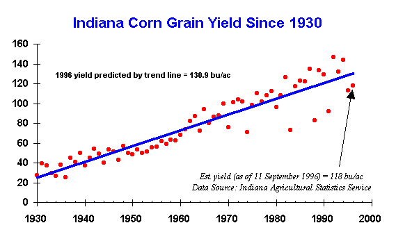 Indiana's 1996 corn crop is estimated to yield 118 bushels per acre,