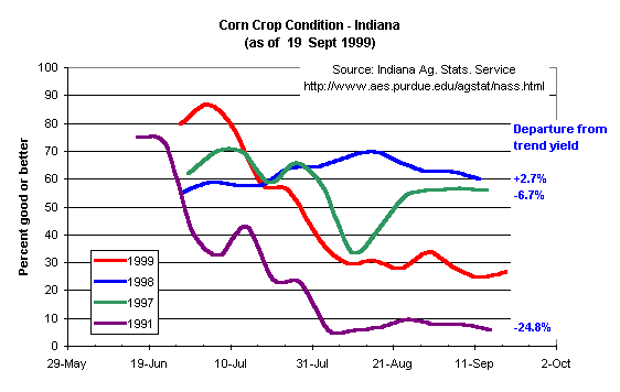 Last updated 20 September 1999.Indiana Corn Crop Condition - 1999R.L. (Bob) NielsenAgronomy Department, Purdue University West Lafayette, IN 47907-1150 Internet address: rnielsen@purdue.edu Indiana's corn crop has experienced dry weather stress in certain areas of the state and crop condition ratings have declined since early July. The accompanying chart illustrates the estimated condition of the 1999 Indiana corn crop compared with that of the 1998 (average year), 1997 (dry mid-summer) and 1991 (severe dry mid-summer) crops, as published by the Indiana Agricultural Statistics Service. The relationship between crop condition ratings and final grain yields is not perfect, but nonetheless offers some idea of what to expect on a statewide basis. The second graph that follows illustrates the relationship between crop condition (percent good and excellent) and departure from trend yield for mid-July, mid-Aug and the mid-July+mid-August mean ratings for the years 1984 through 1998. Based on these relationships, the average crop condition rating calculated from the mid-July and mid-August ratings for Indiana (44.5% good to excellent) would suggest that statewide yield will be about 10 percent less than the calculated 1999 trend yield of 135 bushels per acre, or about 121.5 bushels per acre. The September crop yield estimate for Indiana corn production (Indiana Ag. Statistics Service) was pegged at 128 bushels per acre. |