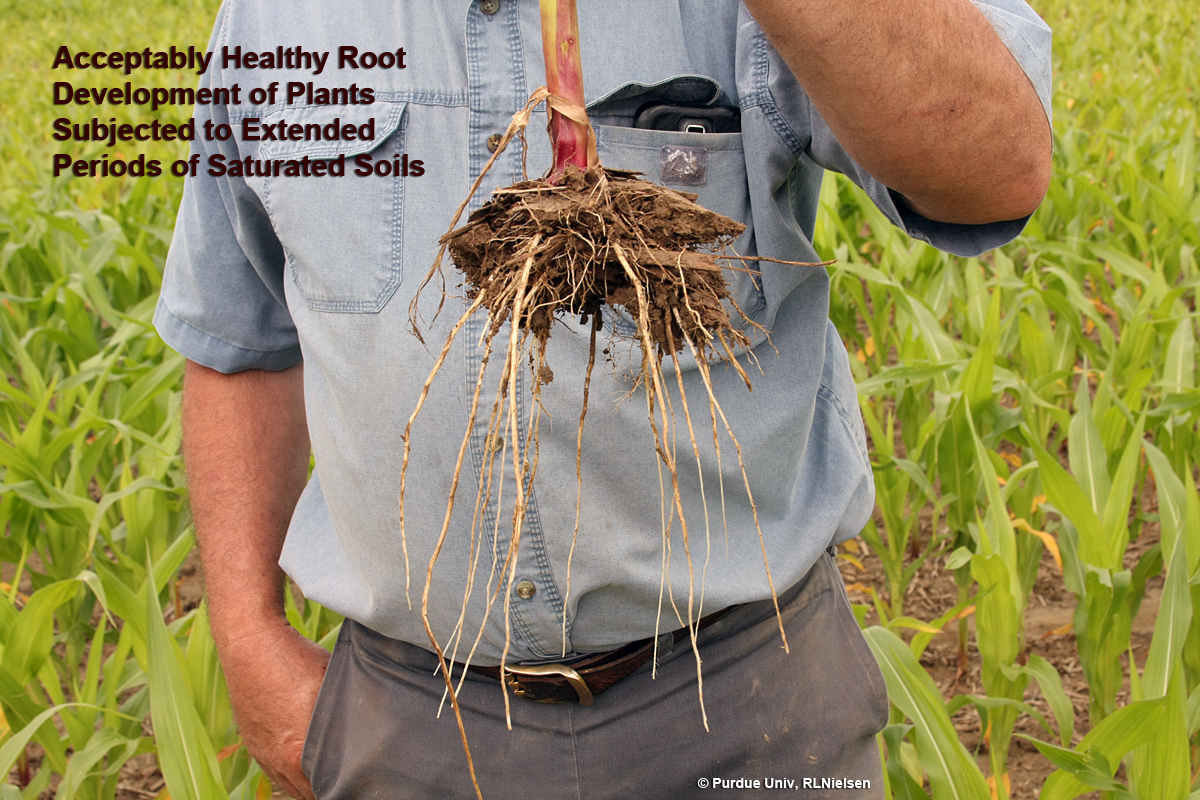 Bright sunshine and warm temperatures help "drive" photosynthesis by the above-ground crop canopy, which provides the necessary photosynthates to support renewed root development below ground. Cloudy, cool days during the recovery period simply slow the recovery process. Repeated re-wetting of the soil profile delays further drying of the saturated soil. Unfortunately, most of Indiana has not yet had a significant string of days with favorable growing conditions and so corn field recovery has been exceedingly slow and frustrating for growers.