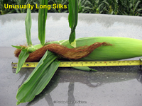 he other day, one of the patrons of Rudy's Bar and Grill walks in with an ear of corn that exhibited long, flowing locks of blonde silks tumbling down the sides of the husk leaves and asked two questions: "Why are the silks so long?" and "Do such long silks bode ill for the success of corn pollination?" Well, maybe the 2nd question was couched in more earthy terms, but you get the drift.