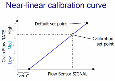 Some manufacturers suggest that only one grain load is necessary to perform an accurate calibration. That recommendation implies the calibration response curve is a straight-line or near-linear relationship between grain flow rates and flow sensor signals (see "Near-linear calibration curve" graphic below). While the standard recommendation is for only one grain load, the "fine print" in the owners' manual suggests that additional calibration loads may be added to fine-tune the accuracy when necessary.