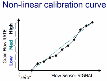 Other manufacturers recommend between 3 and 6 grain loads are required to perform a satisfactory calibration of the yield monitor. This recommendation suggests that the calibration response curve for these yield monitors is not a straight-line, but is rather some sort of non-linear response curve that requires a number of calibration points to best "train" the yield monitor how to interpret the flow sensor signals (see "Non-linear calibration curve" graphic below).