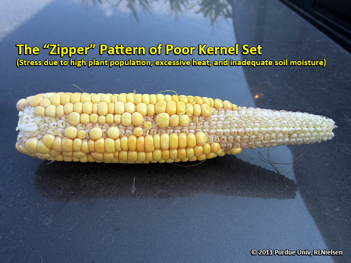 he occurrence of severe photosynthetic stress (severe drought, extreme heat, severe nutrient deficiency, severe foliar disease) during or shortly after pollination in corn often results in poorly filled ears due to incomplete pollination or abortion of young kernels. Often such poor "kernel set" occurs primarily on the tip end of a cob, but some times the problem manifests itself down one side of the cob, affecting several rows of potential kernels. Such a pattern of poor kernel set is euphemistically referred to as a "zipper ear".