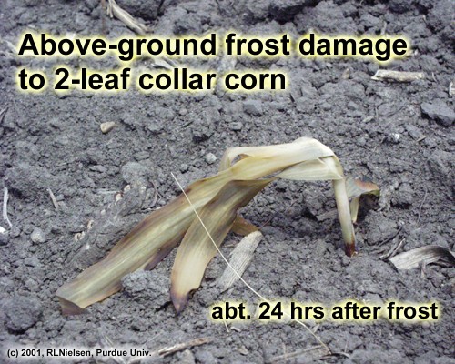 Little of the states corn crop is yet to the 5- to 6-leaf collar stage of development, so the consequences of the frost damage should be minor and limited to death of above-ground plant parts. Corn can easily recover from this type of damage early in its development and suffer no yield loss whatsoever. The fly in the ointment will be any low lying fields where temperatures actually dropped to lethal levels (28F or less). In this situation, even the below-ground growing point may have been exposed to damaging temperatures.