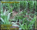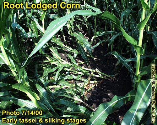 These images are of root lodged corn at the V12 (twelve visible leaf collars) and VT/R1 (tasseling/silking) stages of development following the occurrence of strong wind events in 2000 (VT/R1 plants) in westcentral Indiana and 2002 (V12 plants) in eastcentral Indiana. One of the major contributing factors that made the plants vulnerable to root lodging in both years was severe root damage by corn rootworm (CRW) larvae in a corn/soybean crop rotation. In 2002, the effects of CRW larval feeding on the nodal roots was compounded by very dry soil conditions during the initial nodal root formation period.