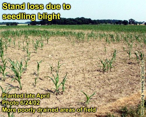 Field location is one of the first clues in determining the likely causes of the stunting. In some fields, the plant stunting occurred in the lower, poorly drained areas and was accompanied by significant stand loss. Seed rot and/or seedling blight were the most frequent causes of the problem in these fields, encouraged by the slow initial pace of corn development that delayed the successful establishment of the nodal root system.