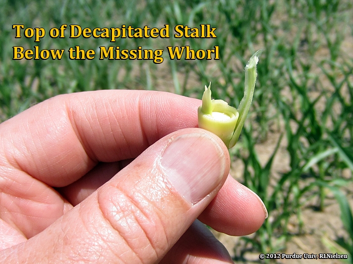 Early in the growing season, deer will sometimes feed on the whorls or tops of young plants from about growth stage V10 (ten leaves with visible leaf collars) to about V16 when the immature tassel, still inside the whorl, is 4 to 6 inches long. Rather than actually eat the whorl leaves, the deer are apparently attracted to the succulent immature tassel. The results are decapitated plants whose young whorl leaves have simply been pulled out and (I can only imagine) the tassel somehow teased out and eaten. The mostly intact, though no longer attached, whorl leaves are left behind on the ground along with the tell-tale evidence of hoof prints and deer scat. The decapitated plants usually survive and ear development will continue through pollination and on to maturity, though the ears are usually less than full size owing to the fact that most of the photosynthetic leaf area above the ears is missing.