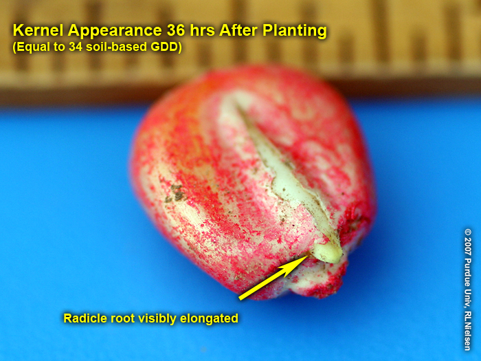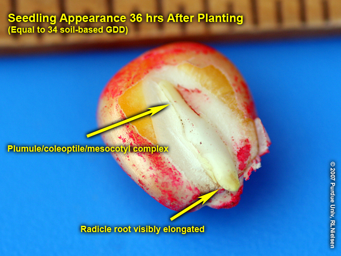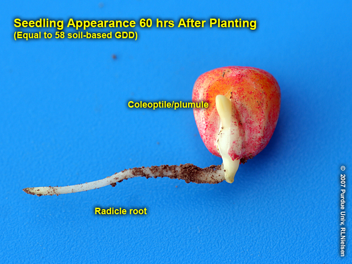 The visual indicators of germination occur in a distinct sequence and are strongly influenced by soil temperature. Germination and emergence will occur in fewer calendar days when the seed is planted into warm soils than in cold soils. However, the thermal time from planting to emergence is fairly predictable, especially if estimated using soil temperature (Nielsen, 2017). Measured in terms of Modified Growing Degree Days (GDD), corn typically emerges in 115-120 GDD (equivalent to about 65 GDD Celsius) after planting.