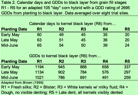 Under "normal" planting dates and growing conditions, the calendar time from individual grain fill stages to physiological maturity is similar across a wide geographical area of the U.S. Midwest. Physiological maturity (kernel black layer) for adapted corn hybrids occurs approximately 65 days after silking in the central Corn Belt (Abendroth et al., 2011; Brown, 1999; Neild & Newman, 1990) and 55 to 60 days after silking in the northern Corn Belt (Lauer, 2016). Earlier maturity hybrids not only reach silking in fewer days after planting, but will also reach black layer in fewer days after silking (Brown, 1999; Nielsen et al., 2002).