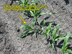 Excessive drying of the upper soil profile is conducive for the development of what some of us affectionately call the "rootless corn" or "floppy corn" syndrome. The problem illustrates a classic example of the importance of the timing of stress relative to stage of plant development.