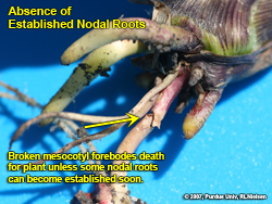 In fact, it is amazing to me how the aboveground appearance of a plant whose nodal roots are desiccating and dying can appear fairly normal up until the fateful windy day when the mesocotyl simply can no longer support the plant and it literally flops over to the ground. "Floppy" corn plants are NOT technically root-lodged; they are simply broken over at the mesocotyl below the crown area of the plant. Obviously, the health of the mesocotyl and the seminal roots determine whether an affected plant can "hang on" until a decent "soaker" of a rain occurs to replenish soil moisture levels.