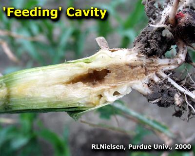On the way home, 'Bob' called one of his insect buddies (John Obermeyer) at Purdue and proudly described his nice piece of detective work. John was skeptical of the diagnosis, partly because 'Bob' reported so few plants exhibited the characteristic 'shot' holes in the leaves that would result from either stinkbug or billbug injury to corn. He also thought the description of the cavity at the growing point area did not fit the diagnosis. Well, the chastened agronomist figured he would visit the field again and look for more evidence that would support either stinkbug or billbug injury and prove to John that the diagnosis was correct.