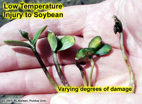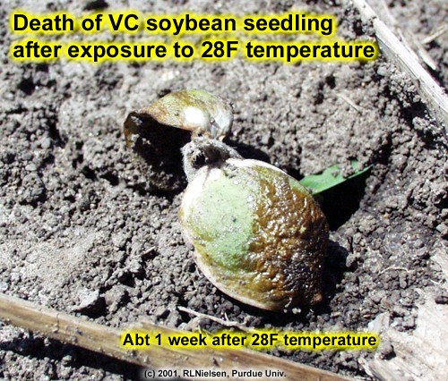 These images illustrate injury symptoms common to young corn and soybean seedlings resulting from damage by frost or lethal low temperatures. The first series of images were taken at the Agronomy Research Center near West Lafayette midday on Wednesday, 18 April, following two successive mornings of low temperatures around 28 F. The second series of images were taken midday on Tuesday, 24 April, or about one week after the potentially lethal low temperatures. The percent survival rate for both crops was significantly less than 50%.