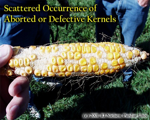 The symptoms include severely scattered kernel set on the ears in varied combinations of successfully developing kernels, unfertilized ovules (blanks) and rather large, white aborted or defective kernels. The corn plants themselves look ‘normal’ in terms of height and color.