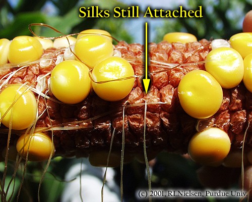 Silks still attachedJust a kernel!Silks still attached to unpollinated ovulesJust a kernel!Silks still attached to aborted kernelsJust a kernel!Closeup of aborted kernels