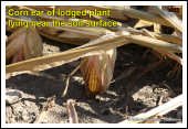 Grain moisture at harvest in fields where immature corn suffered varying degrees of stalk lodging will likely be quite variable because of the varying times of plant death and kernel maturation. Grain from plants that remained standing will mature later than that of immature stalk lodged plants that die prematurely (see above photo of ear comparison). Coupled with variable kernel maturation timing is the moisture consequence of grain on ears of lodged plants that may be lying directly on the ground or in close proximity to the soil surface and, in many instances, shaded by stalks and leaves of the lodged plants (photo below).