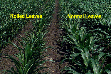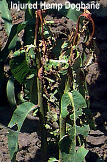 These photos are from a field in Pulaski County, Indiana, that had been sprayed with 2,4-D plus Exceed (prosulfuron + primisulfuron) plus soybean oil. The farmer had spot sprayed portions of the field where hemp dogbane was a problem. A few days after the spray application, drought-like leaf rolling developed in those areas that had been sprayed with the herbicides. Tom Jordan, Purdue Botany & Plant Pathology, attributed the leaf rolling to both herbicides. In addition, some plants near the end of the rows (where the sprayer slowed down) exhibited the fused root symptom that can be caused by 2,4-D.