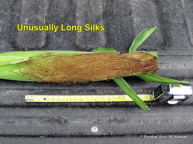 Relatively cool temperatures, cloudy weather, and ample soil moisture promote sustained silk elongation. Coupled with hybrids that may silk one or more days prior to pollen shed from the tassel, silk lengths can become quite impressive.