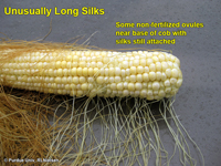 Unusually long silks and corresponding poor kernel set near the base of the cob. Click on images to view larger versions.