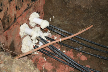 | The drilling is complete. Here you can see two pipes emerging from the ground surface above each of the four holes. | |