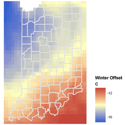 This figure shows the offset between average January air temperatures and annual average annual air temperatures. |