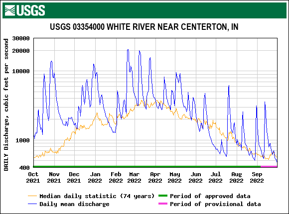 Moderate drought conditions affected 44% of the state by the week of July 12th, according to the U.S. Drought Monitor. Increased precipitation and lower temperatures reduced the extent of drought in late July and August, which resulted in higher streamflow. The Wabash River [4,5] and White River [6] finished the water year with below normal discharge rates, while the other four rivers were at or just above their long-term average discharge rates. Surface water available in state rivers ended the year at or below normal.