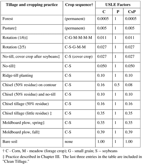 C represents the type of tillage and cropping system used. If there is no land cover (a bare soil with no growing crop), C has a value of 1. On the other hand, C is almost zero (0.0005) under forest. Any growing crop or plant residue that covers the land during at least part of the year will reduce erosion. The C factor for the five tillage/cropping systems described in this manual, as well as some others, are given in Table 12. Some crop residue persists for more than one year on the surface of the soil. In preparing Table 12, we assumed that 25% of the corn residue at planting time lasts until the following planting time, but none of the soybean residue lasts that long. Thus, in a corn-soybean rotation with no-till, soybeans are planted in corn residue only, but corn is planted in soybean residue from the previous fall plus some corn residue from the fall before that. Notice that chisel tillage with 50% residue cover (C = 0.16, Table 12) is much more effective in controlling erosion than chisel tillage with little residue cover (C = 0.35).