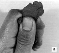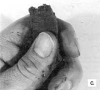 | Do not stick together enough to form a cast, (Picture A) cannot be formed into a ribbon, and is very grainy in appearance. Soil is not sticky. | Forms a good cast (Picture B) and a weak ribbon (Picture C). Surface has a grainy appearance. Soil is not sticky. | Forms a good cast and a moderately weak ribbon (Picture D). Medium-textured soils are slightly sticky. |